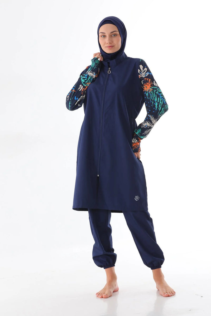 Elif Okur Tam Kapalı Mikro Tesettür Mayo Lacivert Turuncu