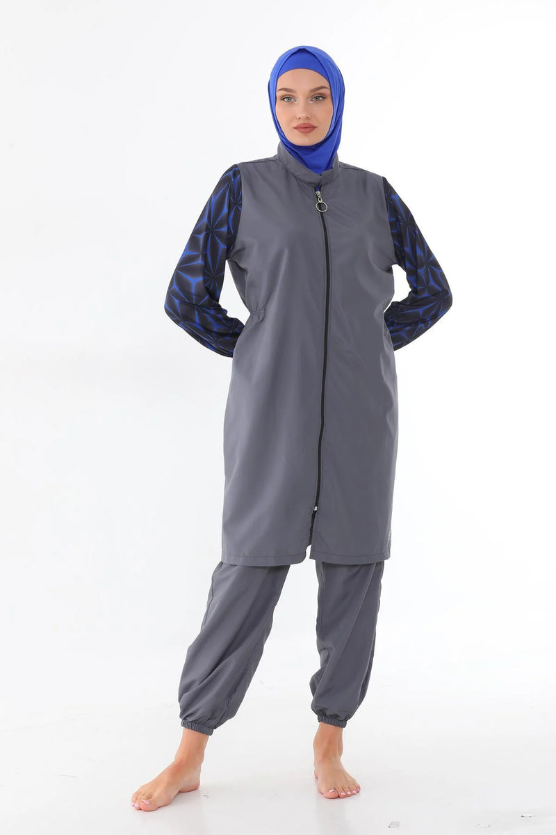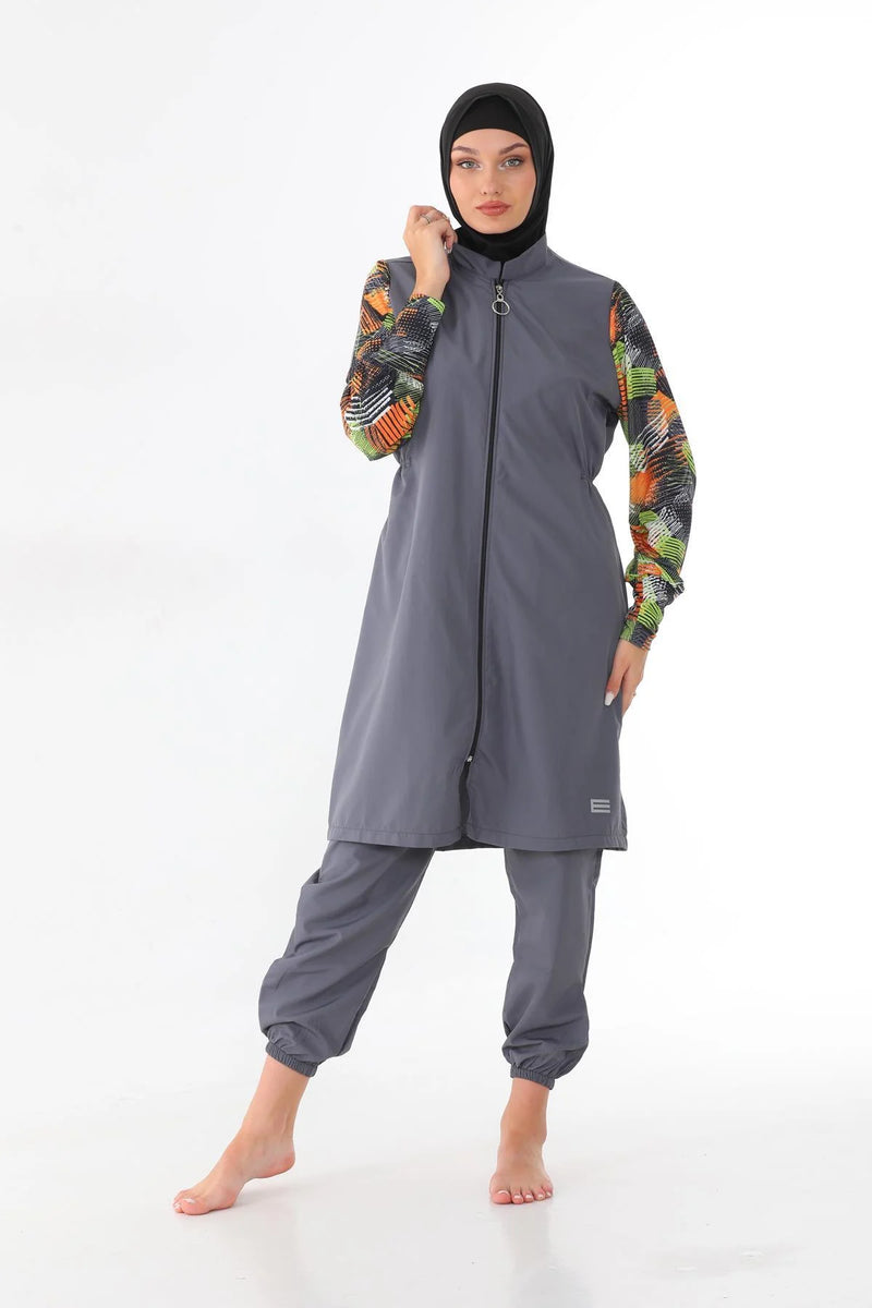 Elif Okur Tam Kapalı Mikro Tesettür Mayo Gri Turuncu