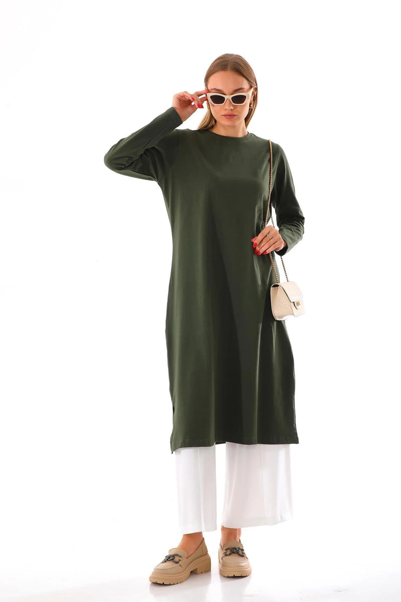 Elif Okur Tesettür Penye Uzun Tunik Haki