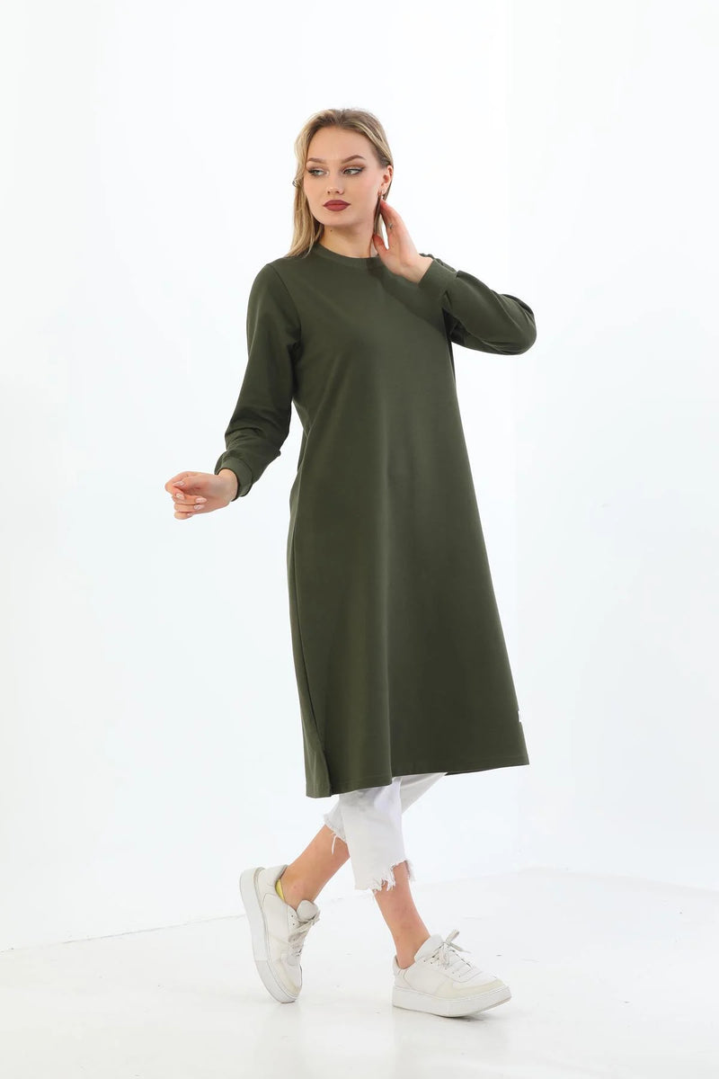 Elif Okur Tesettür Uzun Sweat Tunik Gömlek Kollu Haki