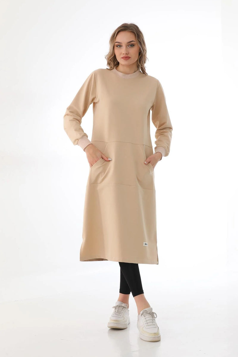Elif Okur Tesettür Cepli Uzun Tunik Bej