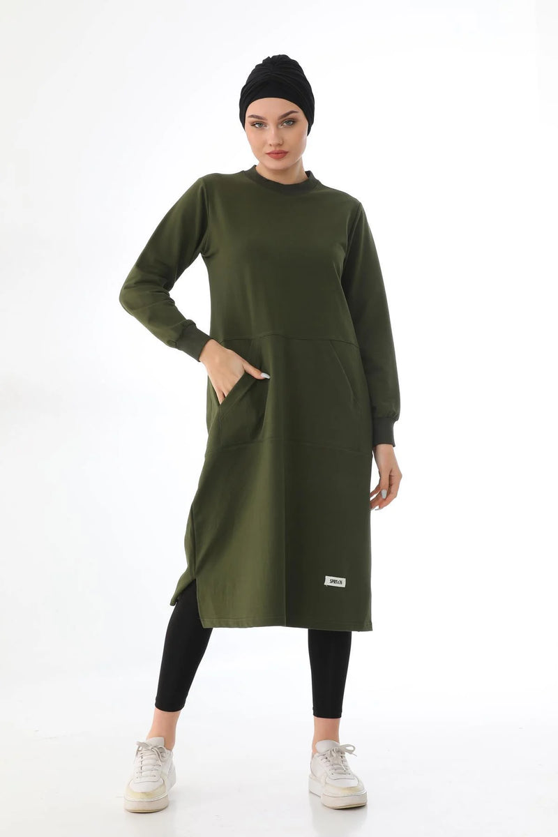 Elif Okur Tesettür Cepli Uzun Tunik Haki